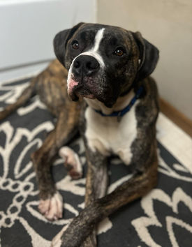 Boulder has learned so much already! He practices place, leash manners, impulse control, and crate time. He wears a muzzle confidently—it means “good things are coming” to him, and it allows him to safely enjoy new experiences like vet visits, nail trims, and outings. With patience and consistency, Boulder is showing he can make great choices and be a wonderful companion.