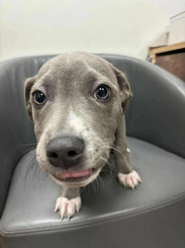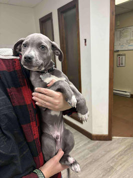 Ryder is the handsome grey pup with two striking blue eyes and a whole lot of love to give! He’s being fostered alongside two pit mix dogs and a cat (who he’s curious about but hasn’t quite figured out yet).
