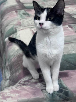 When my foster mom comes into our room, I ask that she pet me . After all, I am quite small and cute. I have sweet little meows that she can't resist. I also have a special treat I expect her to bring me. I don't think I am food motivated, at all unless she has those tasteful treats in that blue squeeze tube. If you want to adopt me, you could find out where those are sold. You could also adopt me with one of my sisters. I will get past my shyness more quickly that way.